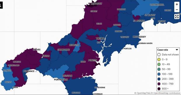 Further case rises can be seen in Cornwall over the past week, with the highest figures remaining in the west and central areas.