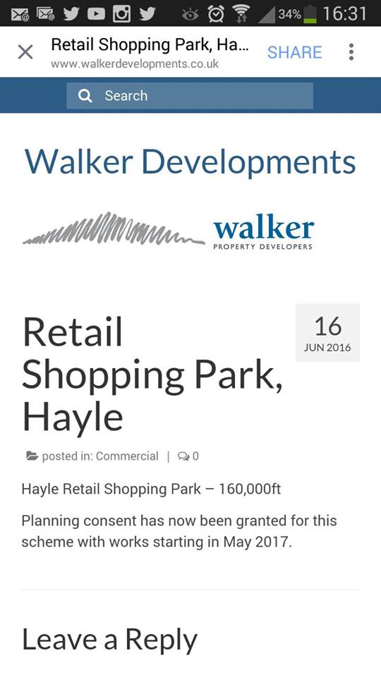 - 160620 | Walker Developments website shows start date for the Hayle Rugby Club Retail Park as MAY 2017. This will be after the