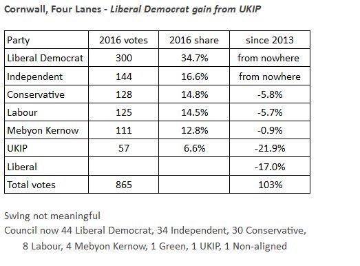 - 160901 | FOUR LANES Cornwall council Caused by resignation of UKIP councillor Derek Elliott | By-election previews 1.9.16 – Ele
