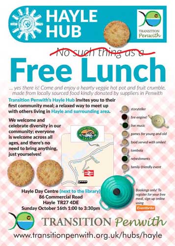The Hayle Hub, part of Transition Penwith, seeks to build positive communities through fun initiatives that promote wide-ranging areas, from social inclusion to sustainability. The hub offered this free lunch to anyone in the area keen to book on, and sought donations from local farms to enable it to happen. The aim was to celebrate the diversity of people in and around Hayle, and to encourage the use of locally-grown foods.