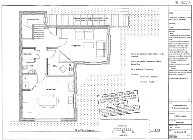 Application 08-1024-P County of Cornwall PENWITH DISTRICT COUNCIL TOWN AND COUNTRY PLANNING ACT 1990 TOWN AND COUNTRY PLANNING (GENERAL DEVELOPMENT PROCEDURE) ORDER 1995 Notice of Conditional Permission for Development To: MR STEVEN HARMAN 26 PENDOUR PARK LOSTWITHIEL CORNWALL ENGLAND PL22 OPQ The PENWITH DISTRICT COUNCIL being the Local Planning Authority HEREBY GRANT permission for the following_development proposed by you in your application dated 20 JULY 2008 and the supporting plans of the land situated at 10 RIVERSIDE, ANGARRACK namely CONSTRUCTION or REPLACEMENT DWELLING on land 0.8; No. PART 3819 (8585 W381) within the parish of. HAYLE. This.approval is granted.subject to the following condition(s): (1) The development hereby permitted.shall be begun before the, expiration Of three years from the date of this permission; (2); No development shall take-place until full details of both hard and soft landscape works have been submitted to and approved in writing by the local planning authority and these-works shall be carried out as approved before any part of the development is first occupied, or the use hereby approved is commenced. The hard landscaping details shall include proposed finished ground levels.or contours; means of enclosure;' car parking layout; other vehicle and pedestrian access and circulation areas; and hard surfacing materials., The soft landscape works details shall include planting plans;fi written specifications; schedules of plants-noting species, plant sizes and proposed numbers/densities where appropriate;' implementation plant All hard and soft landscape works shall be carried out in full accordance With the approved details. Any trees or plants which within a period Of five years from the completion of the_development die, are removed or become seriously damaged or diseased shall be replaced in the next planting season with others of a similar size and species; (3) No development shall take place until details of the materials to be used in the construction of the external surfaces of the building hereby permitted have been submitted to and approved in writing by the local planning authority. Development shall be Your ATTENTION is drawn to the NOTES ATTACHED. (continued). Dated this .....19th..... day of .....September..... 2008 Sustainable Development & Design Manager St. Clare, Penzance. Dec3 ------------------------------------ Application 08-1024-P County of Cornwall PENWITH DISTRICT COUNCIL TOWN AND COUNTRY PLANNING ACT 1990 TOWN AND COUNTRY PLANNING (GENERAL DEVELOPMENT PROCEDURE) ORDER 1995 Application 08-1024-P carried out in accordance with the approved details. For the following reason(s): (1) ,In accordance with the requirements of Section 91 of the Town and Country Planning Act 1990 (as amended by Section 51 of the Planning.and Compulsory Purchase Act 2004). (2) In the interests of visual and residential amenity. (3) In the interests of visual amenity; The planning policies relevant to this decision are: Penwith Local Plan.GD-1, GD-2, H-6, H-18 m Cornwall Structure Plan 1, 2, 3, 10, 16, 26, 27, 28 The full wording of the policies can be inspected at the Council Offices. Reason for Approval The development is considered to be in accordance with the policies of the Development Plan detailed above, and there are no material considerations of such weight as to warrant refusal. Informative (1) This decision relates to the following plans only: PROPOSED: OOl/P/OOl, 002, 003, 004, 005, 006, 007, 008, 009. Sustainable Development & Besign Manager St. Clare, Penzance. Dec3 ------------------------------------ 08-1024 20th July 2008 Design & Access Statement for 10 Riverside, Angarrack Design Statement Mr Steven Harman purchased the land in 2006 with the site already having outlined planning. When purchased there was a derelict house present however as stipulated in the title deeds the house had to be demolished by the owner within the allotted time. It is also stipulates that any new building must not. intrude into the Network Rail safety working area under the viaduct, this distance is 5 metres from the face of the viaduct. The site, measuring approx 256.42 sq. m, is situated towards the North East foot of the Angarrack Rail Viaduct. The site is set on a gentle slope running uphill from the front- of the Site to the rear The boundary around the site is mainly retaining wall apart from the southern boundary, which has no visual boundary with the lawn continuing under the viaduct itself. The only purpose for the land will be residential use. Through Angarrack the housing styles change erratically with semi detached houses, detached houses, bungalows, and terrace housing all being constructed a stones throw from each other. It is hard to see which style of housing: is the more prominent. The aim of the design is to meet current building regulation standards as well as to blend into the surrounding lands'cape with as little visual disturbance as possible however at the same time still manage to be aesthetically pleasing. When looking towards the site from a distance there is no clear common roofline along the top terrace of houses. I have taken the ridge height recorded on topographical survey from the existing dwelling and based my design around the same height. With the site so close to the Railway Viaduct the amount of Sunlight hitting the proposed dwelling was not ideal meaning I had to capture as much of the natural light as possible, maximising its effect within the building in order to keep the property suitable lit thus using less alternative light sources forcing the design to be based around southerly facing glazing. The proposed design is a 3 bedroom detached house. The ground floor measures 79.22 sq. m consisting 3 bedrooms (1 master bedroom with en suite, 1 double bedroom, & 1 single bedroom) and master bathroom with access to the garden. The first floor measures 78.62 sq. m consisting Living room, Kitchen/Diner, Office, WC and Cloakroom. The