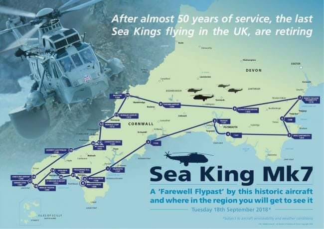 On WEDNESDAY 19th SEPTEMBER, 849 Naval Air Squadron will fly their Sea King Mk7 helicopters on a ‘Farewell Tour’ of Devon and Cornwall - the last flying UK military Sea King helicopters.