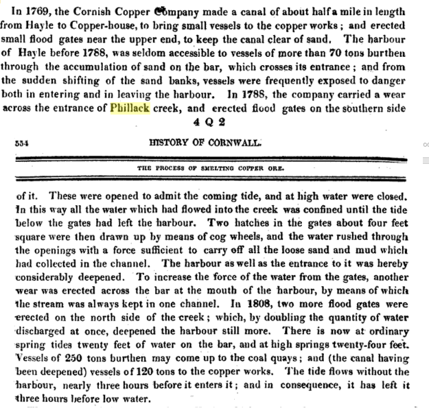 In 1769, the Cornish Copper Company made a canal of about half a mile in length from Hayle to Copper-house, to bring small vessels to the copper works; and erected small flood gates near the upper end, to keep the canal clear of sand. The harbour of Hayle before 1788, was seldom accessible to vessels of more than 70 tons burthen through the accumulation of sand on the bar, which crosses its entrance; and from the sudden shifting of the sand banks, vessels were frequently exposed to danger both in entering and in leaving the harbour. In 1788 the company carried a wear across the entrance of Phillack creek, and erected flood gates on the southern side of it. These were opened to admit the coming tide, and at high water were closed.